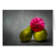 Vue rapprochée de deux poires derrière le parapluie de cocktail rouge. L'eau chute tout autour d'eux. Le ciel est gris et le temps est orageux