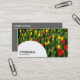 A business card template with a white semi-circular panel in the bottom left for your Company name and business type. The semi-circular panel is placed over a photo or artwork background (which can also be changed). Name and other contact details on the reverse.