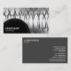 A business card template with a black semi-circular panel decorated with a white dotted line in the bottom left for your Company name and business type. The semi-circular panel is placed over a photo or artwork background (which can also be changed). Name and other contact details on the reverse.