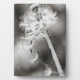 A black and white photograph of a Dandelion plant. The flower has gone and now the breeze is sending out the seeds for future growth.
