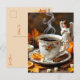 Pretty Fall themed postcard to say hi to a friend or family member. An ai illustration of a warm coffee mug of coffee, orange slices, cinnamon sticks, surrounded by Fall leaves and a pumpkin.
