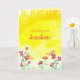 A cheerful "sending you sunshine" thinking of you greeting card decorated with a bright sun with butterflies visiting red wild wildflowers sketched with ink and watercolor. On the inside is a warm yellow watercolor wash with more red wildflowers. You can edit the text to fit your needs.