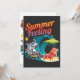 Le design "Sensation estivale" capture parfaitement l'esprit amusant et cool de l'été ! Il représente un requin décontracté portant des lunettes de soleil, assis sur une chaise longue en train de savourer un verre. À côté, un crabe joyeux est visible, se détendant sous un parasol avec un beignet à la main. En arrière-plan, une grande vague et un soleil radieux créent une véritable ambiance estivale.