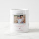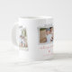 Joyeux cliché photo mug. Fonctionnalités, 3 photos encadrées avec accents lavi style scrapbook, deux lignes de texte modèle rose pour votre message et des noms avec détail de coeur rose.