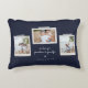 Un coussin de photo photo avec un accent joyeux. Caractéristiques, 3 photos encadrées avec accents de ruban lavi style scrapbook, deux lignes de texte modèles pour votre message et des noms avec détail de coeur en blanc avec arrière - plans bleu marine.
