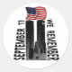 September 11. We Remember. Patriotic memorial tribute to victims of the 9-11-01 terrorist attack on the World Trade Centre, the Pentagon and Flight 93 over Pennsylvania. American flag flies over the Twin Towers in New York City. Never forget.