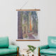 The image captures a serene forest scene with towering sequoia trees. A narrow dirt path winds through the trees, with patches of snow visible on the ground. The bark of the sequoias is a distinctive reddish-brown, contrasting with the green foliage of other trees. The forest floor is covered with fallen leaves and pine needles.