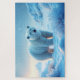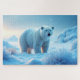 A photo-realistic puzzle design featuring a majestic polar bear standing in a snowy landscape during sunset. The bear faces the viewer directly, with a serious and focused gaze. Its fluffy white fur is lit by soft, warm light, creating a peaceful and serene atmosphere. Snowflakes fall gently in the background as the sun sets over the quiet, frozen landscape. A beautiful blend of strength, calm, and natural beauty — perfect for wildlife lovers and puzzle fans alike.