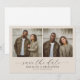 This wedding save the date design features a split layout with two rectangular photo placeholders, each showing individuals against a textured concrete wall. The color palette includes muted earth tones like beige and soft gray, creating a warm and inviting atmosphere. Elegant script and serif fonts highlight the "save the date" message, adding sophistication to the minimalist style. The overall mood is serene and romantic, perfect for capturing genuine moments in a modern yet timeless way.