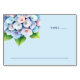 This wedding place card features a charming cluster of hydrangea flowers in soft pastel hues, including pale pink, lavender, and sky blue, set against a light blue background. The design showcases an asymmetrical layout with the floral arrangement on the left, leaving ample space for customization on the right. The elegant serif font adds a touch of sophistication, while the minimalist aesthetic creates a serene and inviting atmosphere perfect for weddings or formal events. The contemporary botanical theme emphasizes natural beauty with clean lines and uncluttered spacing, making it ideal for creating a peaceful ambiance at your special occasion.
