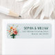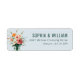 This return address label features a minimalist design with a light blue background and an illustration of a floral bouquet in a vase, showcasing peach roses, white roses, orange peonies, and green foliage. The modern and elegant style is enhanced by the use of soft pastel colours and smooth digital painting techniques, creating a serene and sophisticated mood. The text is arranged neatly on the right side in a bold serif font for names and a lighter weight for the address, ensuring clarity and balance. Perfect for formal occasions, this label combines visual appeal with practicality, making it ideal for those who appreciate understated elegance.