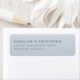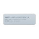 This return address label features a minimalist design with centred text on a soft sky blue background, creating a serene and calming effect. The layout is clean and balanced, utilizing ample negative space to emphasize the elegant serif typography that conveys formality and sophistication. Perfect for formal occasions, this label combines simplicity and clarity, making it an ideal choice for those seeking a modern and understated aesthetic in their stationery.