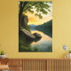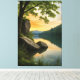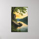 By the lake, where rocks rest and trees frame the view, the sky painted in golden and bluish tones meets its reflection in the calm water. An artwork that conveys peace, connection with nature, and the untouched beauty of sunset.