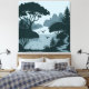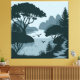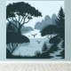A tranquil lakeside scene featuring elegant silhouettes of trees, a winding stream, and distant mountains. Birds gracefully soar above the calm water, evoking a sense of peace and harmony.