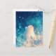 This ethereal postcard features a serene white polar bear gazing upward with a blissful expression, nestled within a magical sanctuary. The artwork is rendered in a dreamlike watercolor style, utilizing a deep and luminous palette of indigo, turquoise, and soft golden light. Delicate blue leaves and sprays of tiny orange-tinted blossoms surround the bear, while shimmering light orbs and soft white speckles create a sense of cosmic wonder. With its peaceful vibe and soft, painterly textures, this piece captures a moment of pure natural harmony. This postcard is a perfect choice for sending a gentle hello, a nature-inspired birthday greeting, or a heartwarming note to any animal lover.