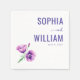 This elegant wedding napkin features a minimalist design with a clean, white background that highlights the deep purple text and floral illustrations. The layout includes bold, uppercase serif typography for names, complemented by delicate script for "and," creating a sophisticated contrast. Soft purple and pink poppy flowers add a touch of natural beauty, enhancing the serene and romantic mood. Perfect for personalizing your special day, this design combines modern style with classic botanical elements to celebrate love in a refined manner.