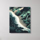 Serene Shores: This stunning top-down illustration captures the harmony of land and sea, featuring waves gently breaking on sandy beaches with lush green mountains in the background. Rendered in soothing shades of dark blue-green, the artwork evokes a sense of tranquility and balance. The intricate detail of the ocean’s patterns meeting the shore, paired with the trees lining the water’s edge, enhances the peaceful atmosphere. Created in a woodcut print style with simple lines and a flat design, the piece is reminiscent of hand-drawn animation, offering a timeless, serene depiction of nature’s beauty.