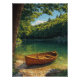 A tranquil lake nestled within a dense forest, its still waters mirroring the trees and sky above. A small rowboat sits quietly along the shore, its presence adding to the calm. The afternoon's golden light casts a warm glow over the lush greenery, emphasizing the balance and clarity of the scene. This landscape captures the serenity of nature, unspoiled and timeless.