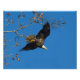 A determined bald eagle launches from a tree branch into a bright blue sky.