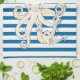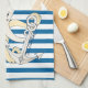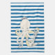 La serviette de cuisine horizontale bleue et blanche lumineuse de conception de motif comporte un thème nautique d'océan avec un poulpe utilisant le casquette et une ancre argentée d'un marin !