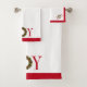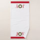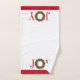 Cette serviette de bain est montrée sur un arrière - plan blanc avec des bordures rouges et texte avec une couronne de baies vertes au centre du mot joie sur tous les articles à chaque extrémité, sauf que le linge est dans un seul coin. Customisez cet objet ou achetez tel que conçu.