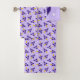 Les deux plus grandes serviettes ont un motif de roquettes rétro violet et des étoiles blanches sur un arrière - plan mauve. Le linge de toilette n'a qu'une seule roche et des étoiles.