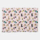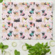 Cute birthday party Pug dogs with black and tan coats dressed in cute birthday outfits with balloons, cake and confeti pattern.