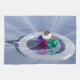 Image 3D créée en Vue, pleine de reflets et de lumières rayonnant de toutes les directions. Cinq sphères colorées de verre bleu, rose, turquoise, orange et diamant se dressent dans une pyramide entourée d'un anneau blanc translucide. Ils s'assoient sur un arrière - plan de rayons bleu pâle et blanc qui convergent sous les cinq boules de cristal.