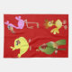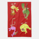 Serviette de cuisine rouge avec des animaux. Perroquet, poussin, coq et flamant rose. Grande idée de cadeau.