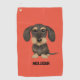 Serviette club de golf avec un joli Dachshund à poils durs et nom personnalisé. Faites un cadeau amusant personnalisé avec les balles de golf Teckel assorties.
