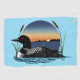 Un huard sur le lac au coucher du soleil et des cattails en toile de fond de bleu