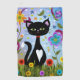Mignonne chatte noire et blanche avec un coeur d'amour blanc sur la poitrine et des yeux vert vif assis dans une longue herbe verte. Elle est entourée de nombreuses jolies fleurs colorées. Des feuilles et de minuscules fleurs flottent autour de sa tête. L'art populaire abstrait numérique conçu par C.Katt.