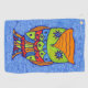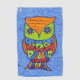 Cette serviette de golf est un mélange de bleu clair et foncé avec une chouette abstraite fantaisiste au visage vert, tête orange et corps coloré aux yeux en forme d'étoile.