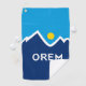 Serviette de golf avec un design avec le drapeau d'Orem, Utah. Un drapeau bleu, blanc et jaune avec des sommets de montagne et le soleil au centre