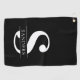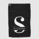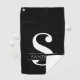 Une élégante serviette de golf dotée d'un monogramme blanc audacieux sur un arrière - plan noir. En haut de ce monogramme sites votre nom de famille.