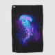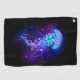 Grande méduse bleue, artistiquement dessinée, brillante, brillante, avec de longues tentacules sur arrière - plan noir avec bioluminescence violette. Méduse brillante.