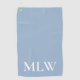 Trois lettres blanches sont en bas. Vous pouvez modifier les lettres pour afficher le monogramme correct. Cette serviette de golf monogrammée est bleu bébé.