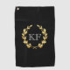 Cette serviette de golf est montrée avec une couronne de laurier d'or sur un arrière - plan noir avec des initiales monogrammes personnalisées en blanc. Customisez cet article et changez les initiales du monogramme en votre nom.