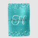 Créez votre propre serviette de golf monogramme personnalisée. Faux bleu turquoise sombre feuille et parties scintillant graphique art numérique le long des bords haut et bas. Customisez le monogramme décoratif royal violet et blanc avec un élégant design de calligraphie de style signature. Vous pouvez customiser et modifier le style de police ou la couleur que vous préférez. Tous les effets de parties scintillant brillants et brillants satinés s'impriment comme une photo sur votre cadeau.