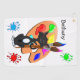 Au premier plan se trouve un chat tuxedo noir et blanc assis debout avec sa queue courbée autour de deux pinceaux d'artiste. Dans l'arrière - plan derrière le chat est une palette d'artiste avec des fragments de peintures de différentes couleurs. Dans le coin supérieur gauche est un modèle en lettres noires pour ajouter votre nom.