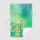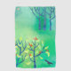 Un paysage moderne et abstrait peint en vert frais avec des oiseaux, un hérisson et quelques arbres lointains. Art original de Nic Squirrell.
