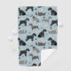Les chiens Schnauzer mignons en noir, sel et poivre et les manteaux noirs et argent s'assoient, se tiennent et se retournent avec des os de chien éparpillés et des empreintes de pattes sur un arrière - plan bleu clair.