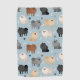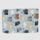 De mignons chiens de Poméranie en noir, gris, crème, chocolat et manteaux rouges s'assoient et se tiennent avec des os de chien éparpillés et des empreintes de pattes sur un arrière - plan bleu clair.