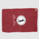 Silhouette noire de dame golfer dans un cadre blanc rond avec nom, sur un rouge rubis imprimé serviette de golf. Personnalisez le nom pour créer un cadeau de golf unique et garder saké. Modifiez le texte pour le rendre vôtre en utilisant le Modèle simple fourni. Dimensions : 16" x 24", 80% tissé polyester/20% polyamide mélangé microfibre, hameçon grommet et laiton inclus. Lavable en machine.