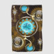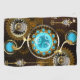 Turquoise lenses with antique watch with brass gears and golden keys on rusty, brown background. Steampunk style.
