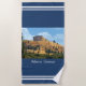 Serviette de plage bleue de 70" x 35" avec une image du glorieux Parthénon au sommet de l'Acropole et des arches de l'amphithéâtre d'Hérode Atticus ci-dessous à Athènes, Grèce. Bordures à bandes blanches doubles. Voir l'ensemble de la collection Greece Beach Towel dans la section HOME.