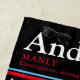 Nom court typographique texte bleu, bleu foncé, bleu ciel, rouge, blanc sur un nom personnalisé arrière - plan noir signifiant design de serviettes de plage. La couleur Arrière - plan peut être modifiée si nécessaire. Un texte graphique personnalisé amusant serviette personnalisée. Personnalisez avec votre nom court et votre signification de nom, actuellement lit Anders Manly. Courageux, forts et vaillants. © Art et design et nom de Sarah Trett pour www.mylittleeden.com
