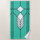 Cette serviette de plage est ornée d'un vitrail art déco de diamants et de lignes en blanc, noir et turquoise.