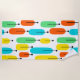 This beach towel has a mid-century modern design of long ovals in yellow, orange, green, and turquoise with black lines with circles on the ends.