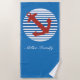 Serviettes de plage de bateau de croisière avec l'ancre rouge sur les rayures bleues. Ajoutez votre nom fait sur commande pour votre croisière ou événement de famille.